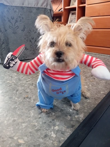 Ready to make your pet the spookiest and funniest guest at any Halloween party? The Puppy Chucky costume is here to turn your furry friend into the ultimate Halloween icon! With its crazy wig and realistic knife, this costume will have everyone both laughing and a little scared.